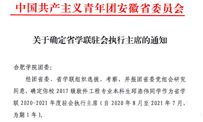 按照《安徽省学生联合会章程》有关规定,团省委、省学联于6月启动2020-2021年度省学联驻会执行主席的遴选工作。经过团省委、省学联组织选拔、考察并报团省委党组会研究同意,邱浩伟同学从安徽省各高校候选人中脱颖而出,当选为安徽省学联2020-2021年度驻会执行主席,这也是太阳城学生首次当选省学联驻会执行主席。