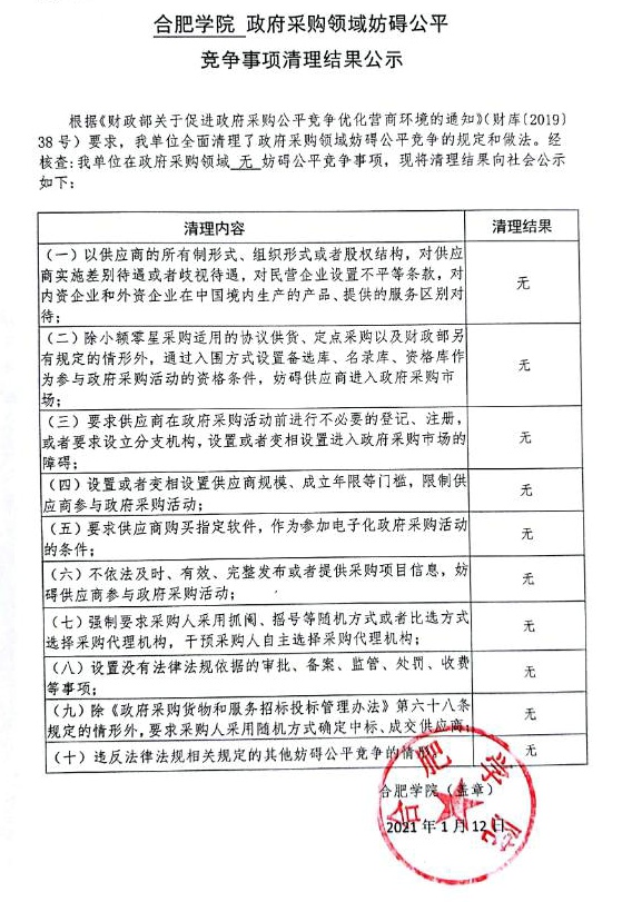 合肥学院政府采购领域妨碍公平竞争事项清理结果公示
