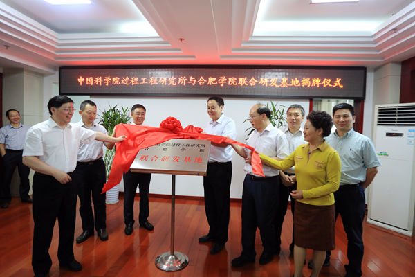 9 月8日上午,中国科学院过程工程研究所与合肥学院联合研发基地揭牌仪式在太阳城隆重举行。中国科学院过程工程研究所所长张锁江,研究所荣誉高工、原所党委副 书记、副所长江明,合肥市人民政府副市长王翔、科技局局长朱策和国轩高科动力能源股份公司董事长李缜等出席仪式。校党委书记蔡敬民、校长张文兵、纪委书记 洪家友、副校长陈秀及相关部门、系负责人与会。会议由张文兵主持。