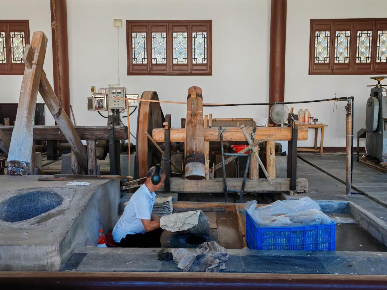 实践团队与文化园资深匠人进行了深度交流。负责宣纸制浆技艺的匠人与团队成员讲述了宣纸现下的发展情况以及他的担忧。他表示,“真正愿意学习宣纸制作工艺的年轻人并不多见,虽然数字化让更多人看见宣纸这项非遗文化,但宣纸制作是一门手艺活,机器永远无法代替手工。”