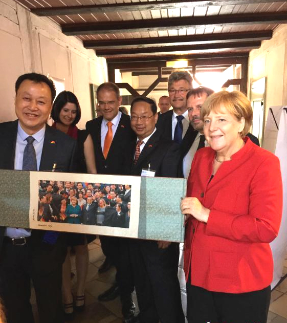 中国驻德国大使史明德、国家汉办(孔子学院总部)主任许琳出席仪式。党委书记蔡敬民代表合肥学院于现场向默克尔总理展示并赠送了由去年中德两位总理访问学校期间合影制作的纪念品。