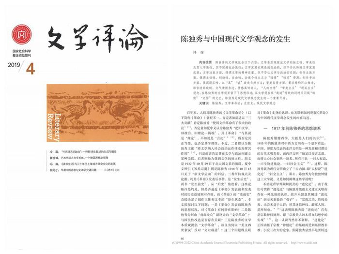 论文《陈独秀与中国现代文学观念的发生》以反思西方中心论为背景,以“内应外援”为立场,以“史前史”为方法,系统分析皖籍新文化旗手陈独秀之文学观,以点带面研究中国现代文学观念的发生,使人们看到陈独秀文学观的复杂性以及对“五四”文学观念产生的重大影响。研究成果既体现了建设中国文论话语体系的努力,也体现了还原皖籍新文化人物群体历史贡献的努力,可为当代中国文论和安徽文化强省建设提供重要支撑。