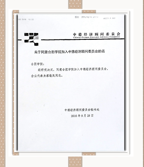 Am 28.09.2016 erteilte der chinesisch-deutsche beratende Wirtschaftsausschuss des chinesischen Handelsministeriums in einem offiziellen Schreiben an die Universität Hefei die offizielle Genehmigung zu ihrer Beteiligung am chinesisch-deutschen beratenden Wirtschaftsausschuss. Als Vertreter wurde der Parteisekretär der Universität Hefei, Prof. Cai Jingmin, ernannt. Die Universität Hefei gilt als der erste Hochschulvertreter des Wirtschaftsausschusses und wird im Oktober an der Rundtisch-Konferenz zur industriellen Zusammenarbeit zwischen Deutschland und China (Provinz Anhui) in Peking teilnehmen.