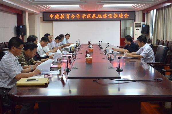 Mit ihnen diskutierte Prof. Dr. Cai Jingmin, Parteisekretär der Universität Hefei, tiefgehend über den Aufbau der Modelleinrichtung der Bildungskooperation zwischen China und Deutschland. Herr Cai referierte über die aktuelle Situation des Aufbaus der Modelleinrichtung der Bildungskooperation zwischen China und Deutschland. „Eine Musteruniversität der Kooperation“ ziele darauf hin, dass eine Musteruniversität wie die Universität Hefei aufgebaut werden solle und die Umgestaltung einer lokalen Universität zu einer anwendungsorientierten Hochschule ins Auge gefasst werden müsse. Das konkretere Konzept nennt sich „Die sechs Plattformen“, worunter die chinesische und deutsche Bildungskooperation, ein Entwicklungszentrum der Lehrkräfte der chinesischen und deutschen anwendungsorientierten Hochschulen, ein Austauschzentrum der Bildungsforschung zwischen chinesischen und deutschen anwendungsorientierten Hochschulen, ein Austauschzentrum der chinesischen und deutschen Qualifizierten, ein Innovationszentrum der chinesischen und deutschen Hochschulen und Unternehmen sowie einUnternehmensgründungszentrum fallen.