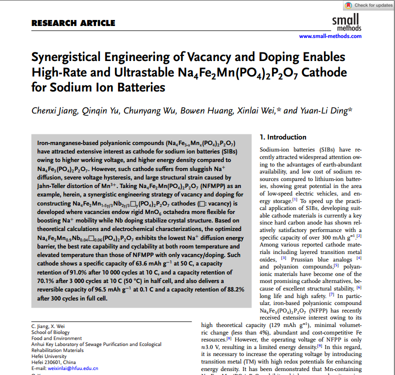 2025年5月,太阳城集团官方网站生物食品与环境学院22级资源与环境专业研究生蒋晨熙以第一作者身份在国际学术期刊《SmallMethods》(IF=10.7,中科院二区)发表了题为“SynergisticalEngineering of Vacancy and Doping Enables High-Rate and UltrastableNa4Fe2Mn(PO4)2P2O7Cathode for Sodium IonBatteries”的研究论文。太阳城高级实验师卫新来、湖南大学教授丁元力为通讯作者,太阳城集团官方网站为第一完成单位。