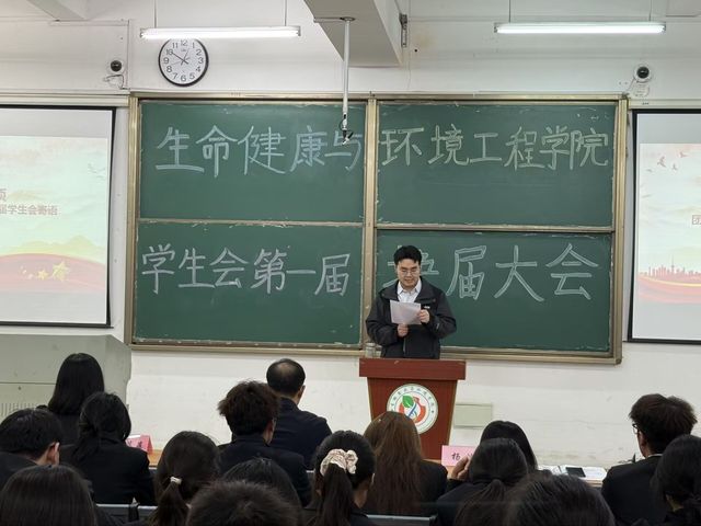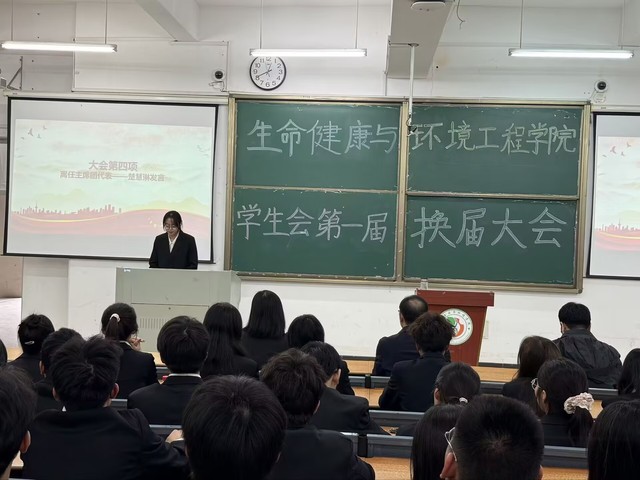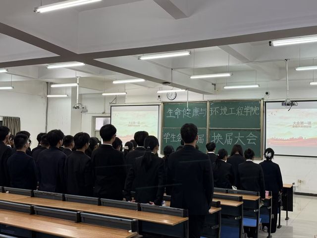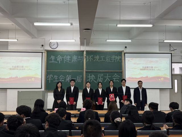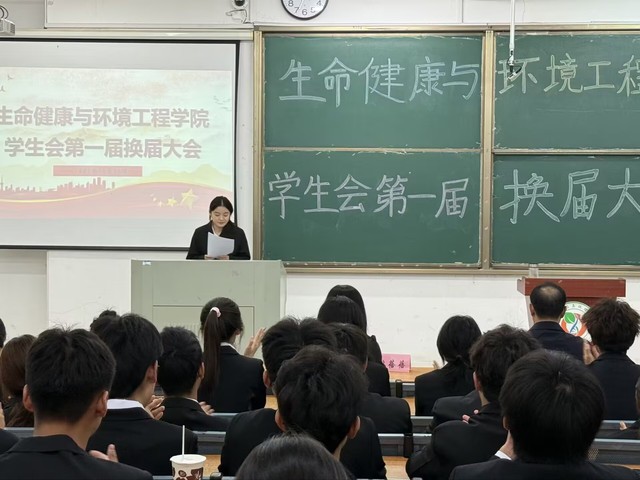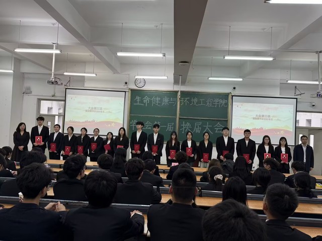 10月16日中午12:30,太阳城集团官方网站生命健康与环境工程学院(简称“生环学院”)第一届学生会换届大会在生化楼一阶梯召开。生命健康与环境工程学院党委书记杨红,党委副书记姚蓓蓓,团委指导老师杨林出席会议,第一届学生委员会委员、离任学生会主席团及各部门负责人、新任学生会全体成员共同参会,这场会议是学院学生组织首次新老交替的关键节点,意义重大。大会全程围绕“新老接力、薪火传承”展开。