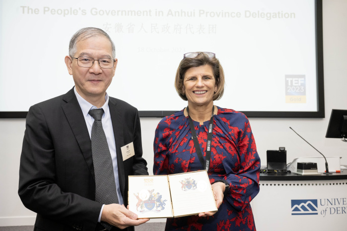10月18日,在王清宪、唐锐、托尼·金及安徽省政府代表团的见证下,王其东代表学校与德比大学校长凯西·米切尔(Kathryn Mitchell)签署了校际合作框架协议,开展师生互访、学生培养、科研合作等。