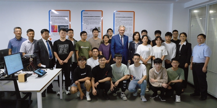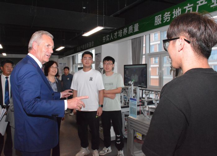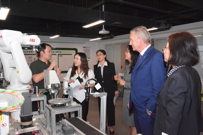 武尔夫一行还参观了大众学院校企实训平台,在多模态设备健康评估实验室、智能制造系统集成技术应用及创新中心、数字孪生技术及工程应用中心调研了学科建设、模块化课程、实训教学等情况,高度肯定了太阳城“地方性、应用型、国际化”的办学定位。
