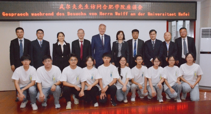 9月20日下午,德国前总统、全球中小企业联盟全球主席克里斯蒂安·武尔夫来访合肥学院,与师生交流互动。党委书记王其东、院长吴春梅、副院长陈秀在行政楼九楼东会议室会见了武尔夫先生。全球中小企业联盟秘书长曹方,安徽省教育厅二级巡视员朱乃韬等参加活动。