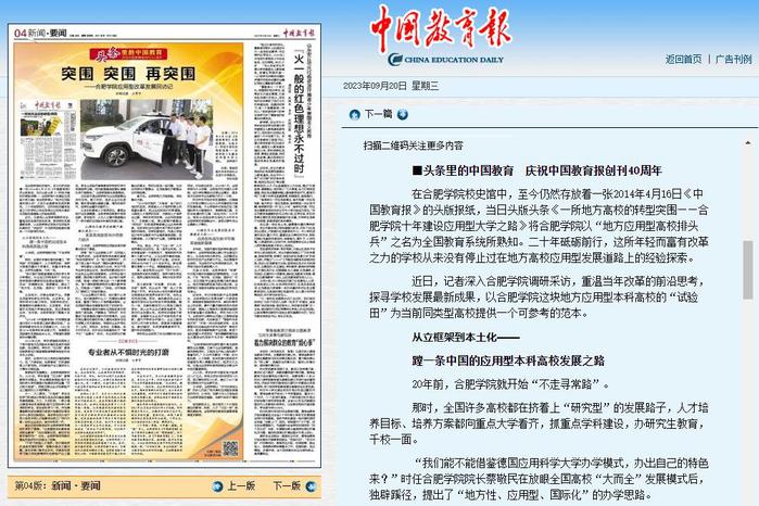 在合肥学院校史馆中,至今仍然存放着一张2014年4月16日《中国教育报》的头版报纸,当日头版头条《一所地方高校的转型突围——合肥学院十年建设应用型大学之路》将合肥学院以“地方应用型高校排头兵”之名为全国教育系统所熟知。二十年砥砺前行,这所年轻而富有改革之力的学校从来没有停止过在地方高校应用型发展道路上的经验探索。