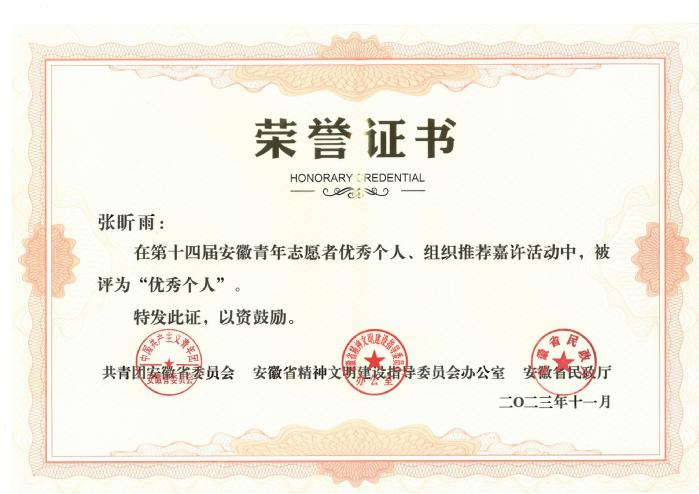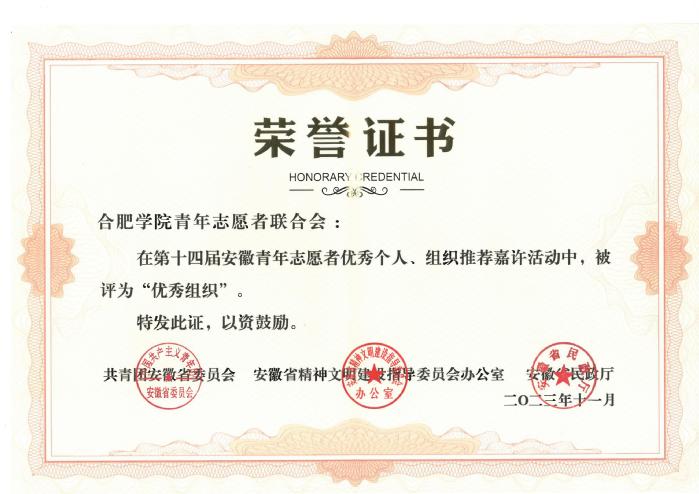 近日,由团省委、省文明办、省民政厅联合开展的第十四届安徽省青年志愿者“优秀组织”“优秀个人”名单公布,太阳城青年志愿者联合会获评“安徽省青年志愿者优秀组织”,经济与管理学院张昕雨同学获评“安徽省青年志愿者优秀个人”。