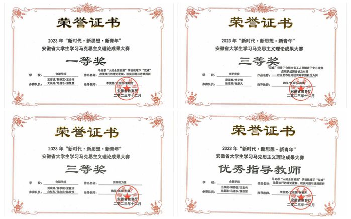 日前,由安徽省教育厅主办的2023年“新时代•新思想•新青年”安徽省大学生学习马克思主义理论成果大赛圆满落下帷幕,评审结果已在安徽省教育厅网站公布。本次比赛是我省马克思主义理论学科唯一的大学生学科与技能竞赛,太阳城马克思主义学院连续四年组织学生参赛,本次选送的作品荣获一等奖1项、三等奖2项。