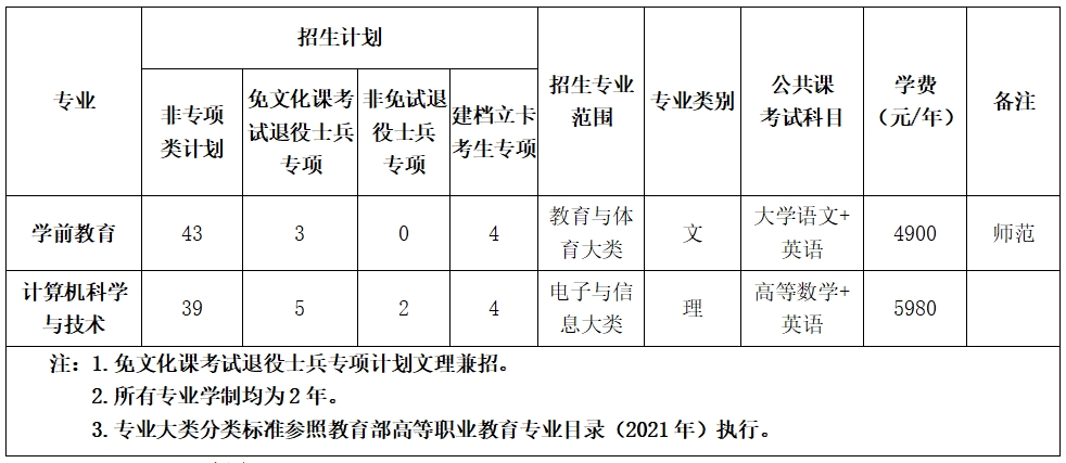 学前教育专业:在公共课达到省考试院划定的公共课考试合格分数线且两门专业课(学前教育学+学前心理学)总分必须达到110分(含110分)的基础上,根据考生考试科目的成绩总和从高分到低分排序,按非专项类招生计划数择优录取,如考生考试科目的成绩总和相同,则按单科顺序及分数从高到低排序,按非专项类招生计划数择优录取,单科排序为:学前心理学、学前教育学、大学语文、英语。