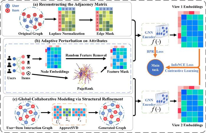 针对上述问题,刘玉升所在团队提出了一种基于邻接矩阵重构与属性自适应扰动的图增强方法,能够在保持原始语义信息的同时,自适应地去除图中的噪声干扰,从而提升推荐系统的性能与泛化能力。项目组通过长达16个月的持续攻关(包括10个月的反复实验验证与6个月的论文撰写与修改),研究成果《Graph Augmentation Empowered Contrastive Learning for Recommendation》发表于CCF-A类国际权威期刊《ACM Transactions on Information Systems》。