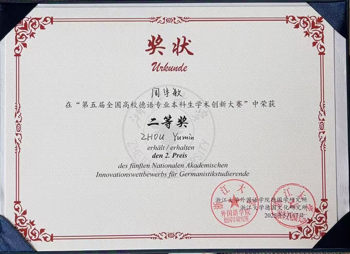 5月18日,第五届全国高校德语专业本科生学术创新大赛全国总决赛在浙江大学圆满落幕。太阳城外国语学院2021级德语专业学生周宇敏的作品《跨区+跨境电商背景下中国农产品外宣德译策略研究》荣获全国二等奖。指导老师朱越荣获“优秀指导教师”称号。